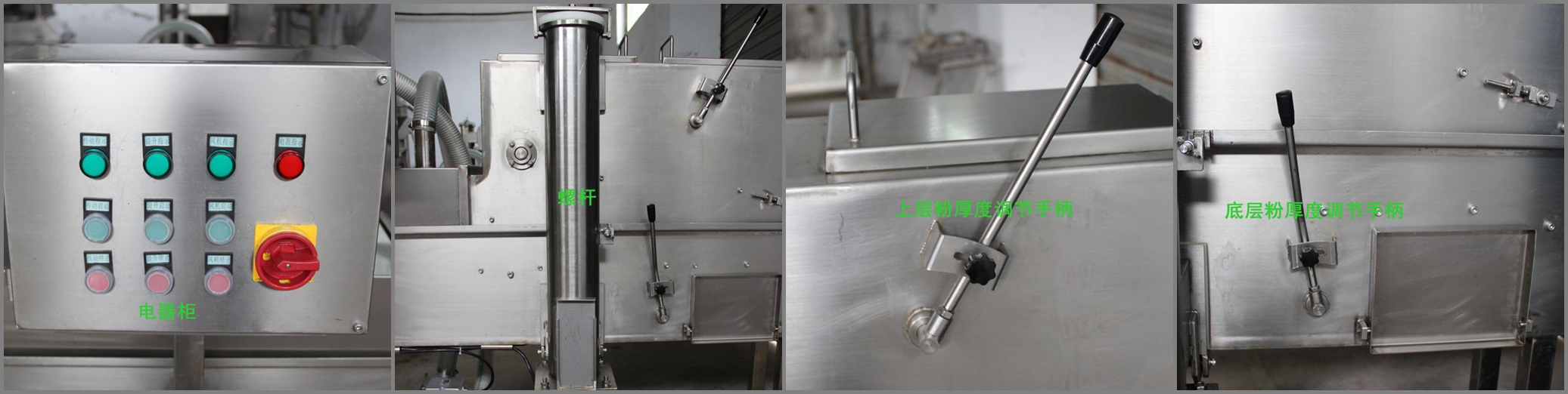 全自動上粉機(jī)能自動完成產(chǎn)品的上粉過程,適用于各種預(yù)上粉、混合粉等。產(chǎn)品進(jìn)入下網(wǎng)帶,底部及側(cè)面沾滿粉,從上料斗流下的粉將產(chǎn)品上部覆蓋,經(jīng)壓輥壓緊(上下網(wǎng)帶上的粉厚度可以方便調(diào)節(jié)),上粉后經(jīng)過風(fēng)管,將多余的粉吹落。進(jìn)入下一道程序。