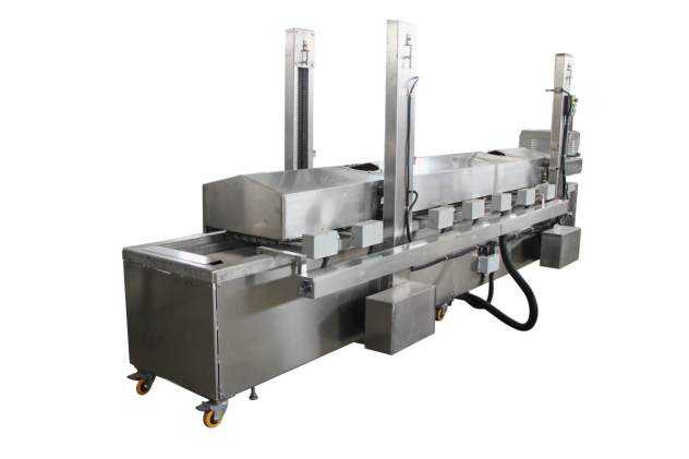 電加熱油炸機(jī)由網(wǎng)帶輸送系統(tǒng)、自動(dòng)刮渣系統(tǒng)、濾油系統(tǒng)、網(wǎng)帶提升系統(tǒng)、油溫自動(dòng)控制系統(tǒng)、電加熱系統(tǒng)等幾部分組成。